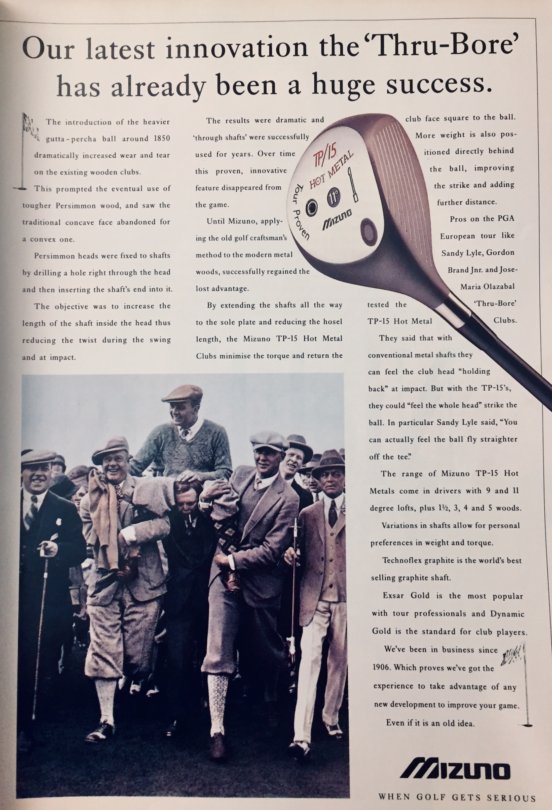 Sadly the numbers of persimmon players were dwindling by the late 80’s and Mizuno were quick to act with premium metal TP heads. Faldo had a prototype Hot Metal in play during his record-breaking 1990 St. Andrews Open win. TP metals were also notable for continuing the success of the Exsar Gold graphite shaft.